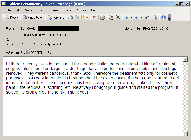 "Hi there, recently I was in the market for a good solution in regards to what kind of treatment, surgery, etc I should undergo in order to get facial imperfections, mainly moles and skin tags removed. They weren't cancerous, thank God. Therefore the treatment was only for cosmetic purposes. I was very interested in hearing about the experiences of others and I started to get inform on the matter. The main questions I was asking were: how long it takes to heal, how painful the removal is, scarring, etc. Relatively I bought your guide and started the program. It solved my problem permanently. Thank you!"