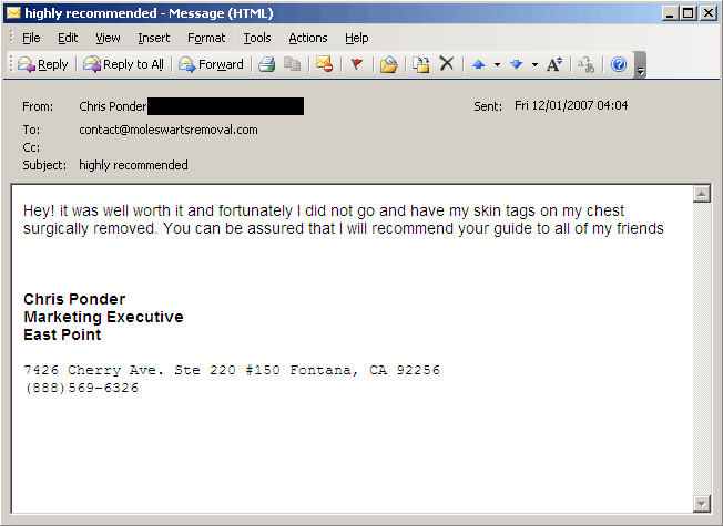 "Hey! it was well worth it and fortunately I did not go and have my skin tags on my chest surgically removed. You can be assured that I will recommend your guide to all of my friends."