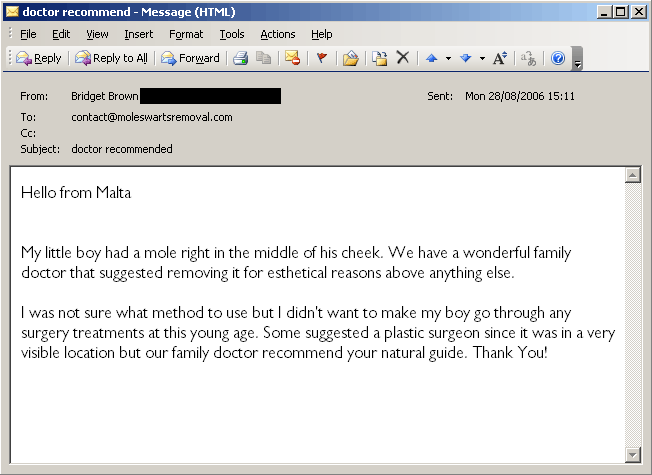 "I had a large mole on the middle of my cheek that bothered me for many years. I didn't wanted to see a doctor because a friend of mine that had her mole surgically removed ended up with a large scar on her face. Not wanting a similar fate I searched online for a natural remedy and I found your website.