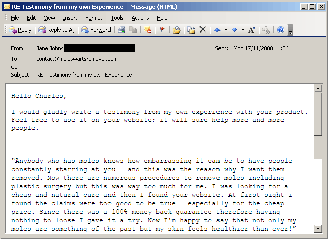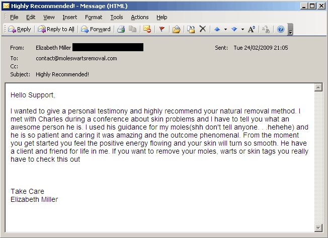 "Anybody who has moles knows how embarrassing it can be to have people constantly starring at you - and this was the reason why I want them removed. Now there are numerous procedures to remove moles including plastic surgery but this was way too much for me. I was looking for a cheap and natural cure and then I found your website. At first sight i found the claims were too good to be true - especially for the cheap price. Since there was a 100% money back guarantee therefore having nothing to loose I gave it a try. Now I'm happy to say that not only my moles are something of the past but my skin feels healthier than ever!"