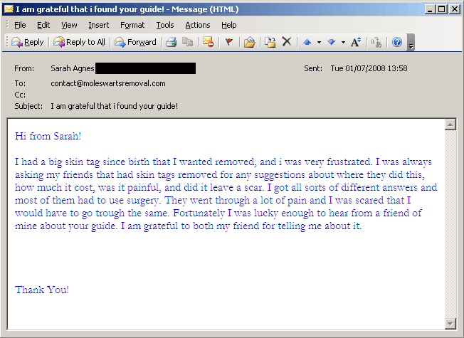 "I had a big skin tag since birth that I wanted removed, and i was very frustrated. I was always asking my friends that had skin tags removed for any suggestions about where they did this, how much it cost, was it painful, and did it leave a scar. I got all sorts of different answers and most of them had to use surgery. They went through a lot of pain and I was scared that I would have to go trough the same. Fortunately I was lucky enough to hear from a friend of mine about your guide. I am grateful to both my friend for telling me about it. Thank You!"